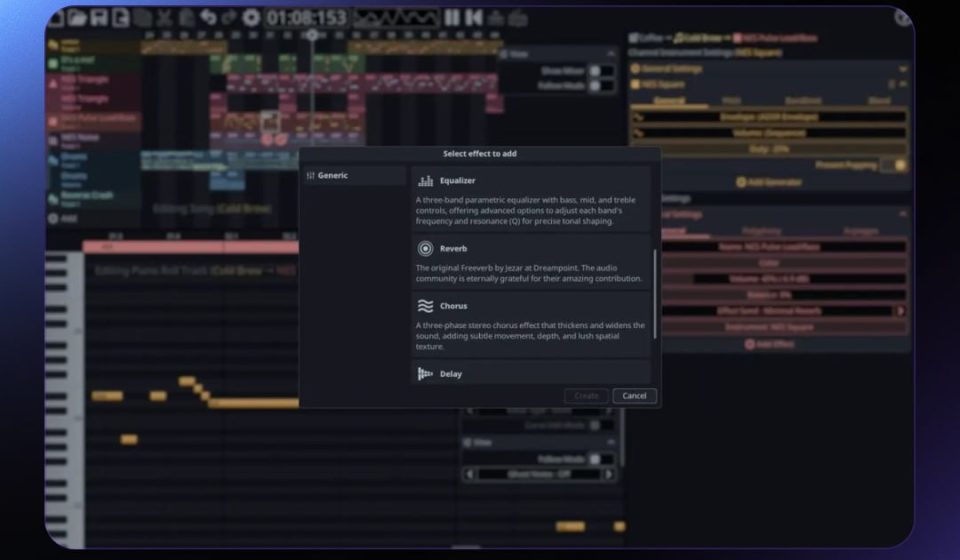 - Импорт/Экспорт: Поддержка MIDI для обмена проектами и рендер готового аудиофайла.