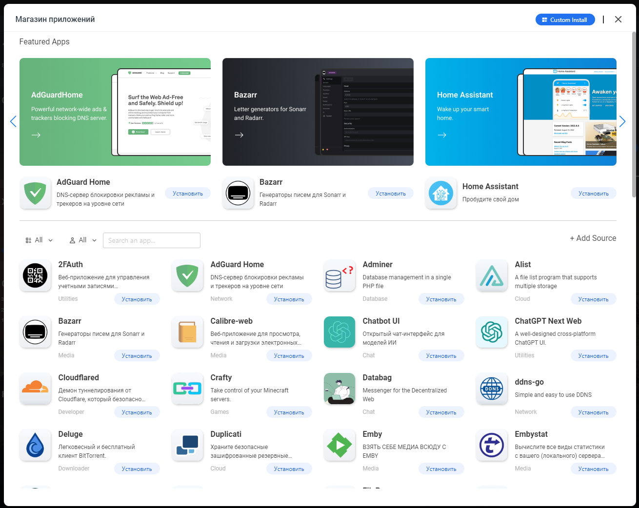 Здесь мы можем видеть Состояние системы, Хранилище, Статус сети. Магазин приложений App Store, который позволит нам установить новые контейнеры Docker.