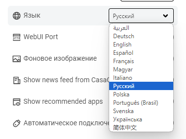 Настройки позволят настроить систему, в том числе поменять порт, по которому будет доступна система, изменить Язык и т.д. Доступных языков много: