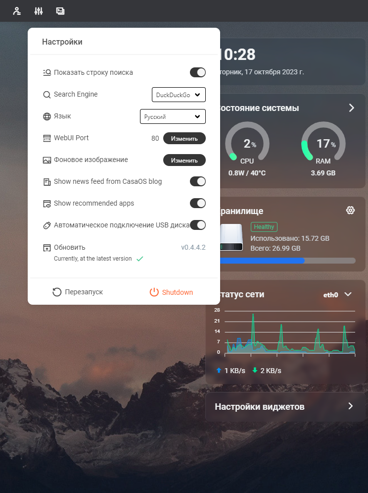 Теперь мы попадаем в главное меню CasaOS: