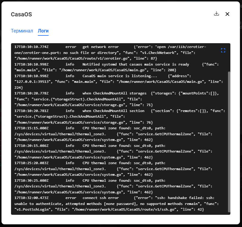 Во вкладке Логи, можно посмотреть и скачать логи системы:
